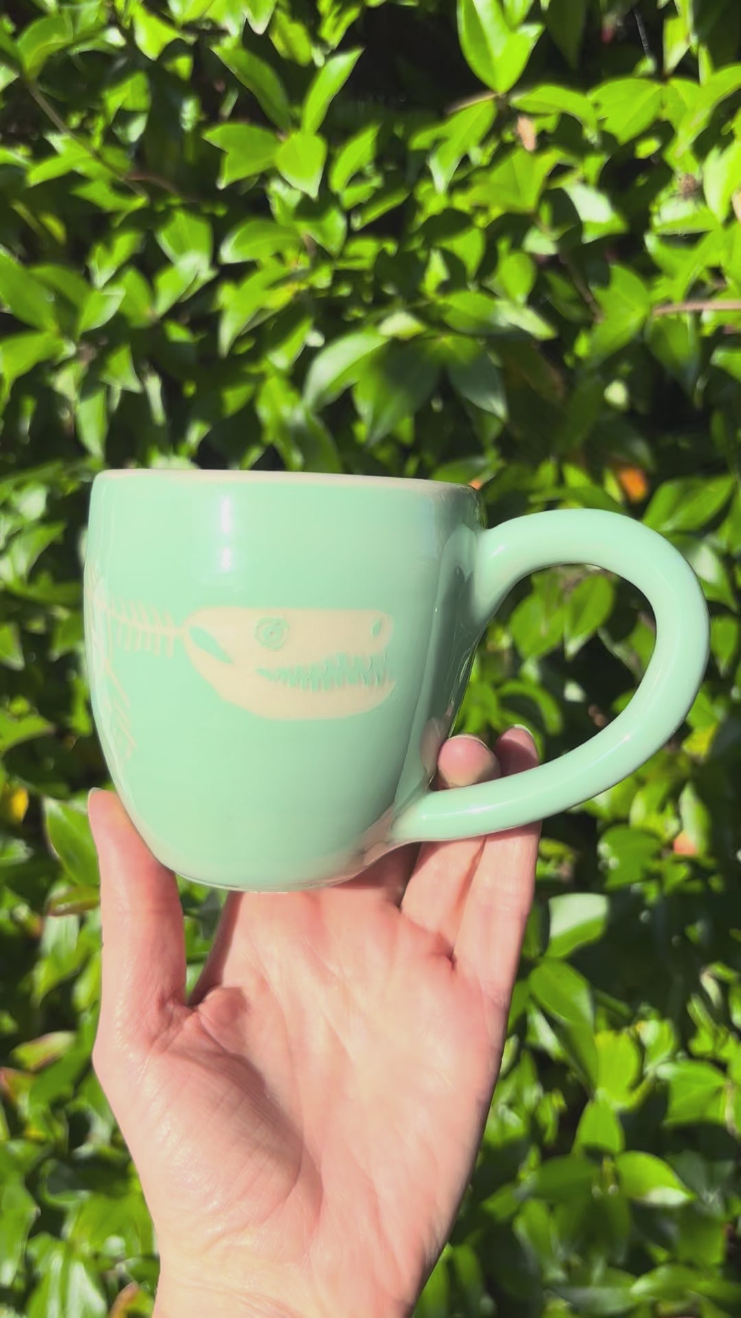 Take a sip from our quirky handmade stoneware mug, carved with the ancient and awe-inspiring Pliosaur. In a unique aqua color, this mug will bring playful personality to your morning coffee (or tea, if you're feeling fancy). Drink up(dated) with our Aqua Pliosaur Mug!