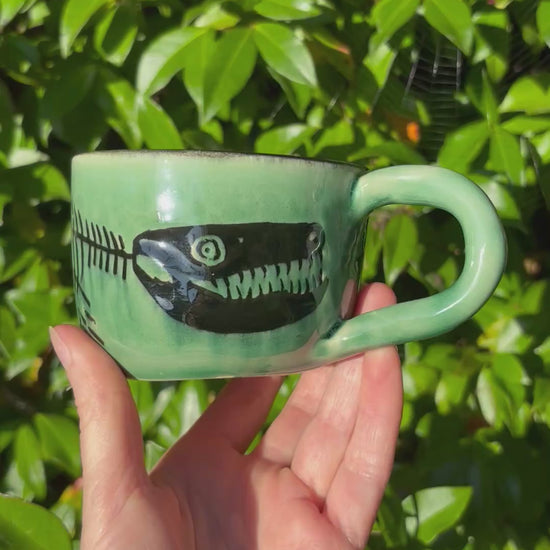 Be the envy of all your fellow coffee lovers with our Emerald Green Pliosaur Mug! Handcrafted from stoneware, this mug features a unique, carved design of a Pliosaur fossil inlaid with black slip. Sip your morning java in style and add some prehistoric charm to your kitchen.