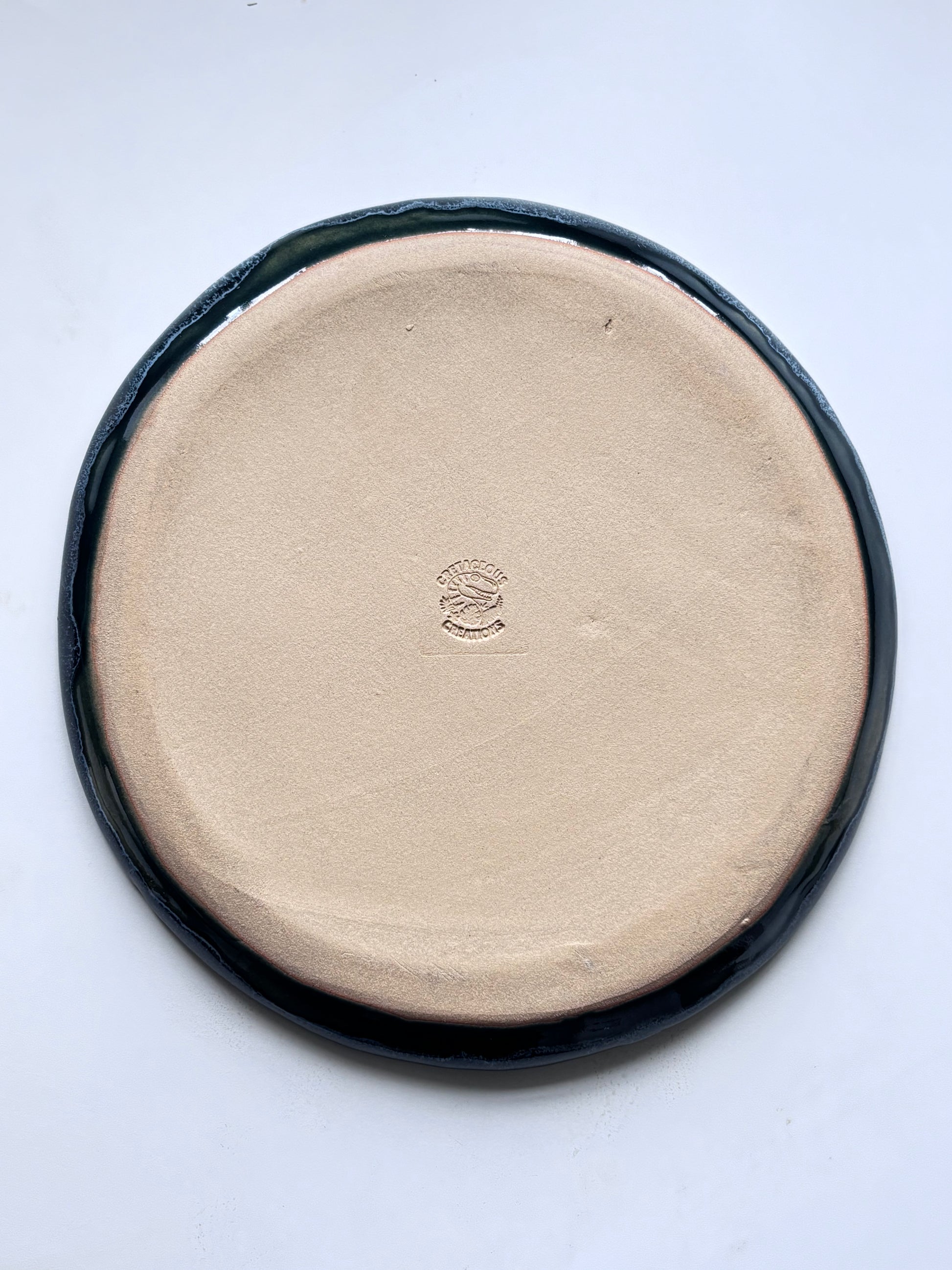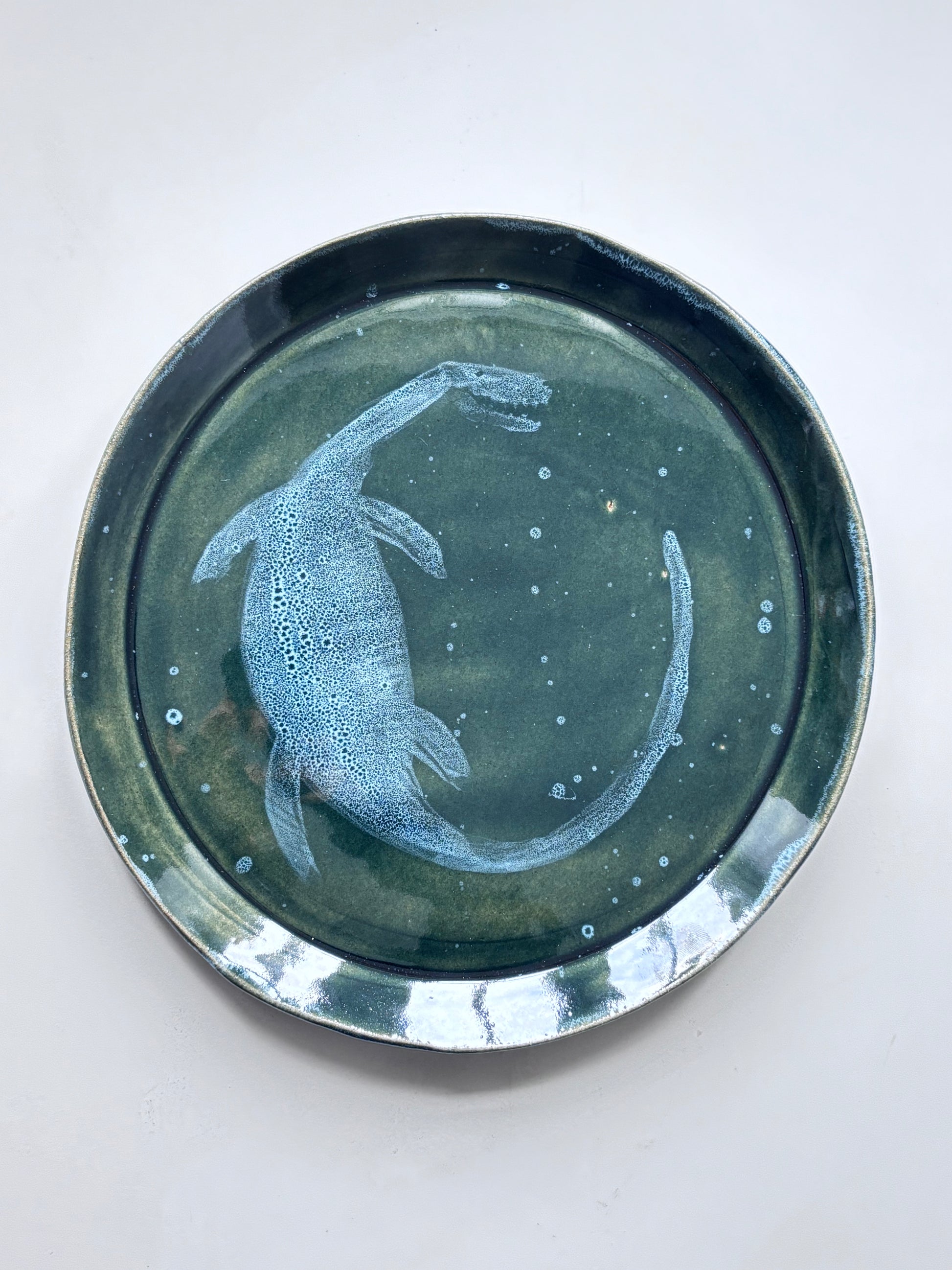 Indulge in the timeless beauty of our handmade stoneware plate. Crafted with care, each piece is uniquely adorned with an ancient sea reptile design in a captivating bubble glaze effect. Versatile for everyday use or as a stunning décor piece. Plus, it's dishwasher and microwave safe for added convenience. Elevate your table with this one-of-a-kind artistic creation.