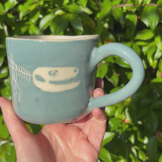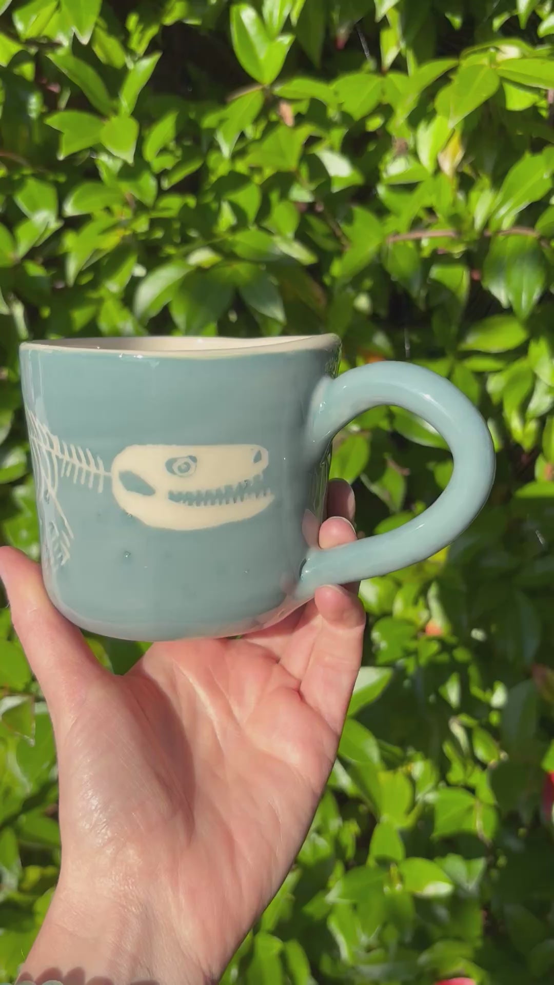 Sea blue handmade carved Pliosaur stoneware fossil mugMake a splash with our Sea Blue Pliosaur Mug! Handmade with a carved fossil design, this mug is perfect for dino lovers and coffee connoisseurs alike. Sip in style and quirkiness with this one-of-a-kind mug. Hurry, before they go extinct!