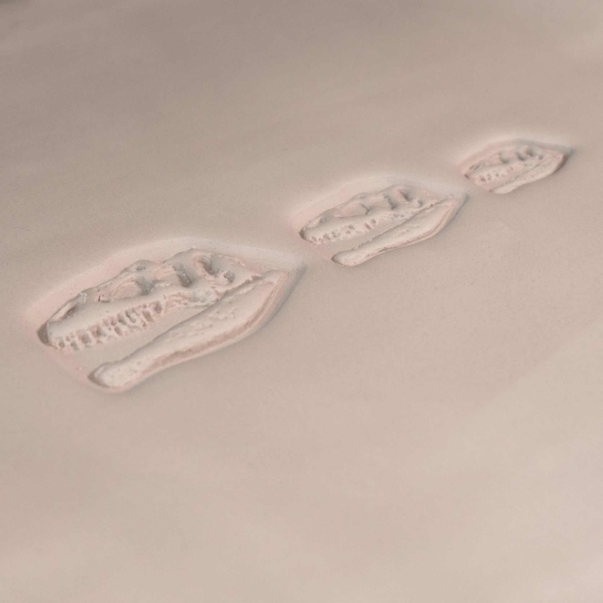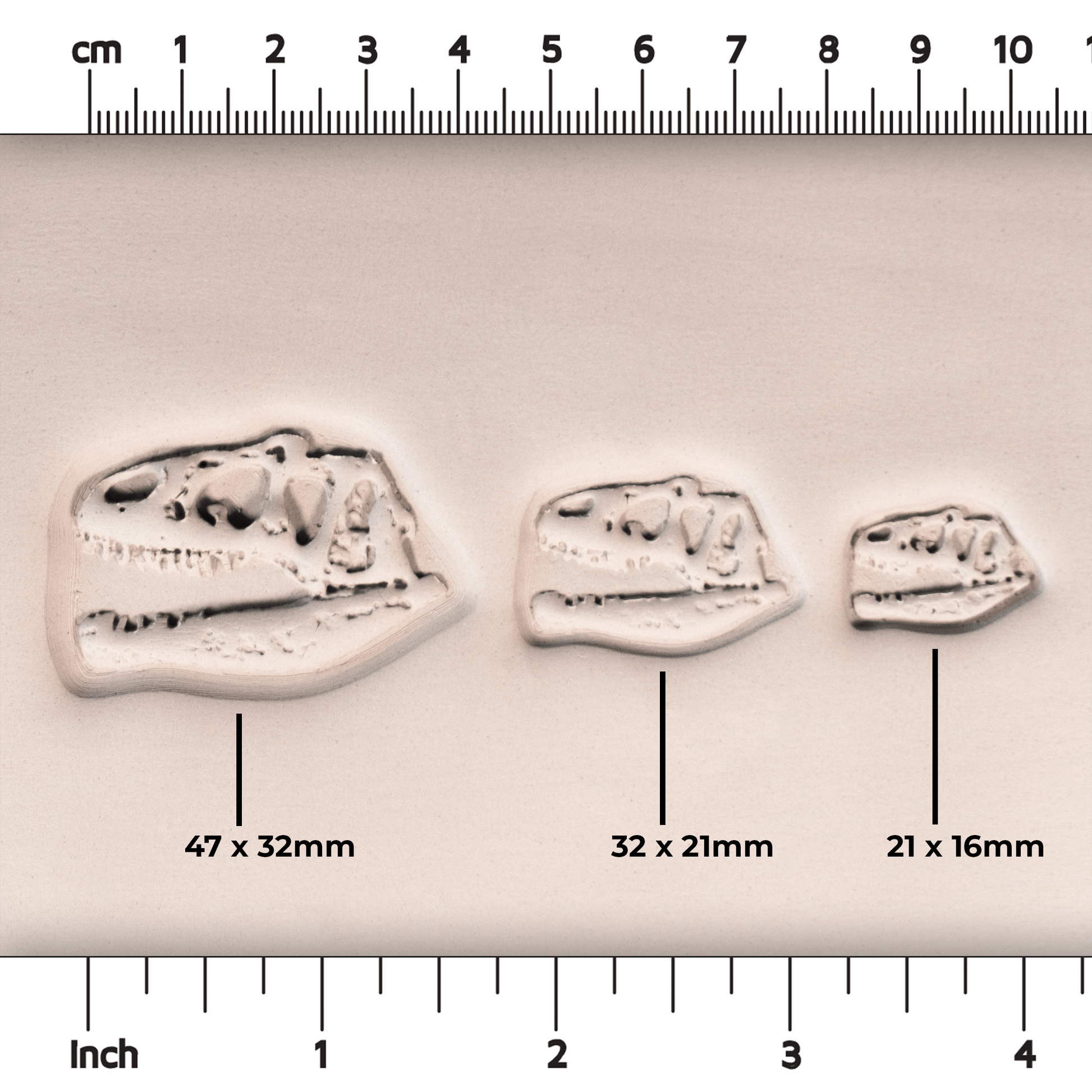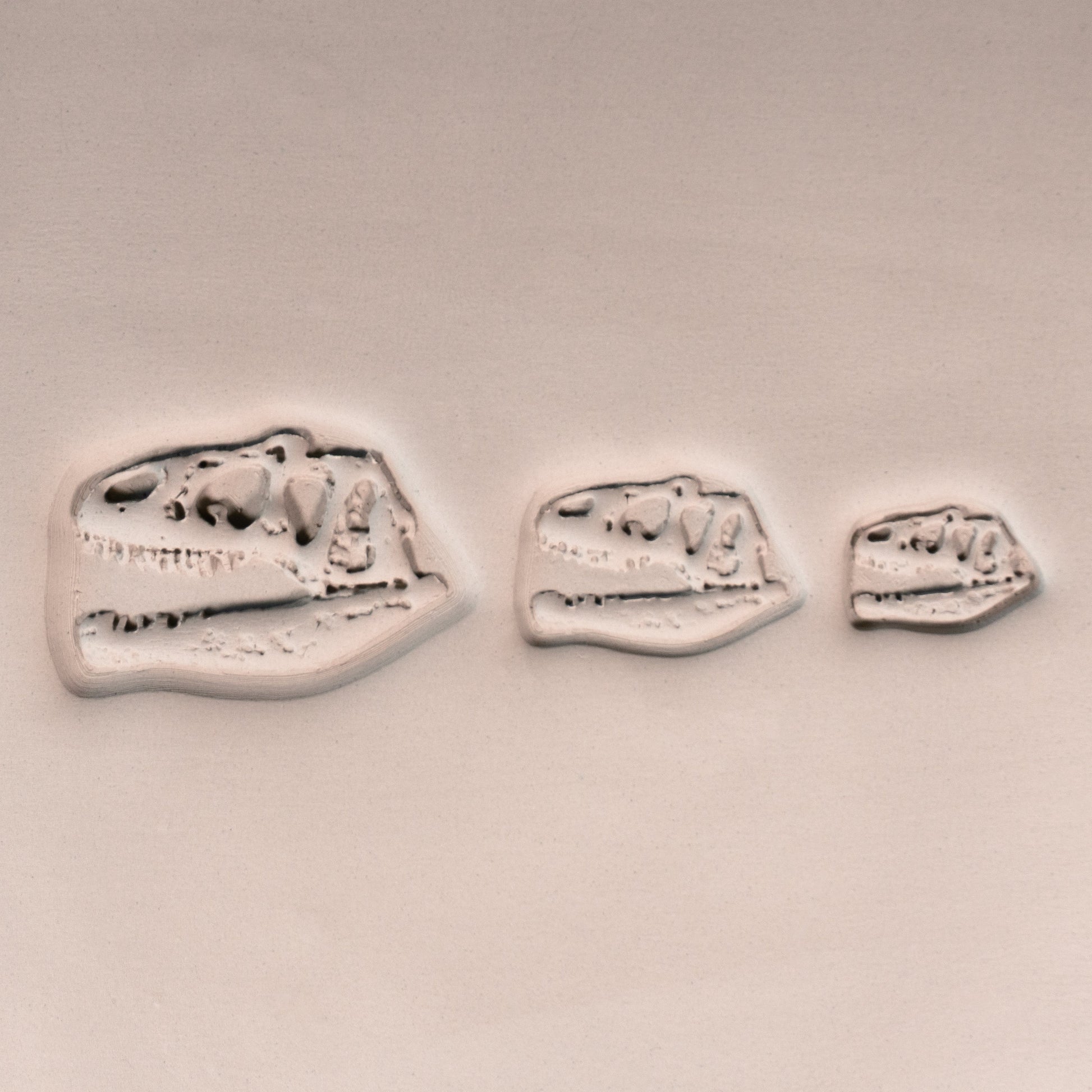 This is a T-Rex dinosaur skull fossil stamp available in three sizes that is perfect to use on any dish or piece that you are creating that you want to have a dinosaur, prehistoric, or fossil theme.